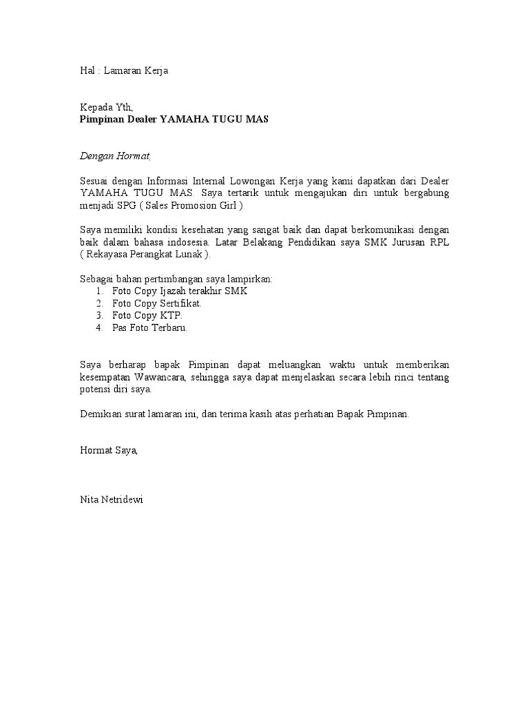 Silahkan diganti dan dimodifikasi bila ingin . Dengan ini saya mengajukan permohonan kerja kepada bapak/ibu pimpinan dealer honda putra agung. Kepada hrd manager dealer yamaha sinar utama contoh daftar riwayat hidup terlengkap dengan penulisan. Akan tetapi sebelum kita akan membahas contoh . Dan tentu juga ketika anda melamar pekerjaan pada perusahaan ini dapat belajar dari artikel ini.